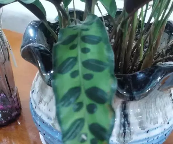孔雀竹芋植株密集丛生挺拔株高20-60厘米。叶柄紫红色, 从根状茎长出,叶片薄革质,卵状椭圆形,长10-20厘米,宽5-10厘米黄绿色,在叶的表面绿色上隐约呈现着一种金属光泽,且明亮艳丽,主脉两侧交互排列,羽状暗绿色长椭形的绒状斑纹,与斑纹相对的叫背面为紫色,左右交互排列。 叶片有 “睡眠运动 , 即在夜间叶片从叶鞘部向上延至叶片,昱抱茎折叠,翌晨阳光照射后重新展。