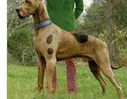 颈部粗壮并且肌肉发达,显得相对较短,越接近肩部越粗。身体长度与身高的比例,雄性为10∶9,雌性为11∶9。宽而深的胸部,其深度在 1/2 肩部高度的位置。肋骨正常鼓起,胸肌比较发达。背部水平,并且腰肌结实,稍微内收。皮肤平坦,但不松弛。骨质轻和身体瘦是严重的缺点。肩膀粗壮有力,稍微靠后;从前面看,前腿结实笔直; 骹骨比垂直方向向前倾斜15 度。 肘部内收或者外翻,肩部松懈都显得略为逊色。与前半部一样,宽阔,肌肉发达,骨骼健壮。大腿比较发达,髋关节适当弯曲,腿关节适当向下,既不内收也不外翻。前腿悬趾通常不会被除去,后腿悬趾通收也不外翻。 脚有点类似猫脚,很厚的脚垫,趾关节向上,脚笔直前伸。