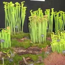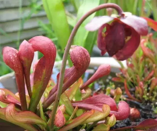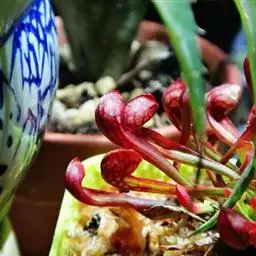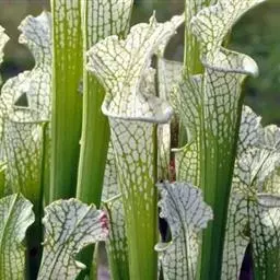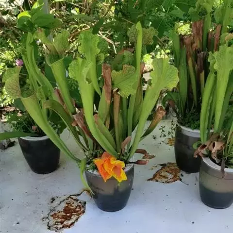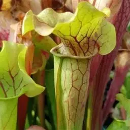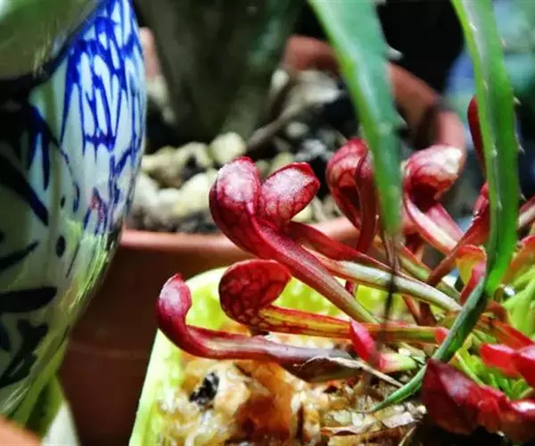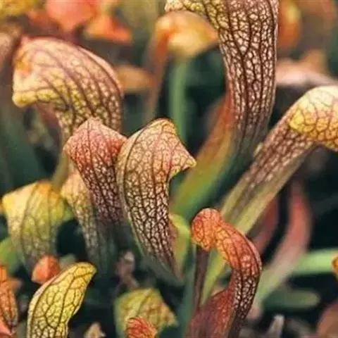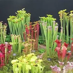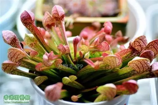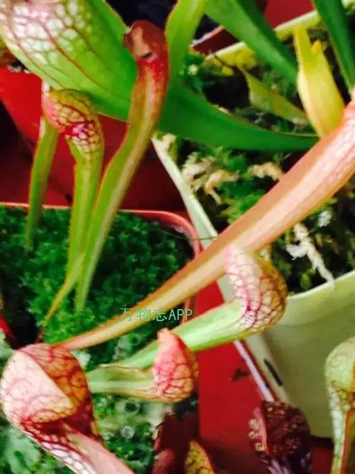瓶子草是一种相对体形较大气质高雅的食虫植物,叶子成瓶状直立或侧卧,颜色 鹦鹉瓶子草 鲜艳,有绚丽的斑点或网纹,形态和猪笼草的笼子相似,能分泌蜜汁和消化液,受蜜汁引诱的昆虫失足掉落瓶中,瓶内的消化液会把昆虫消化吸收。