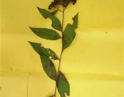 叶片菱状披针形至菱状长圆形,长3-5厘米,宽1.5-2厘米,先端急尖,基部楔形,边缘自近中部以上有缺刻状锯齿,上面深绿色,下面灰蓝色,两面无毛,有羽状叶脉;叶柄长4-7毫米,无毛。