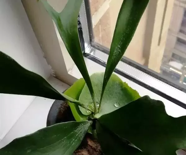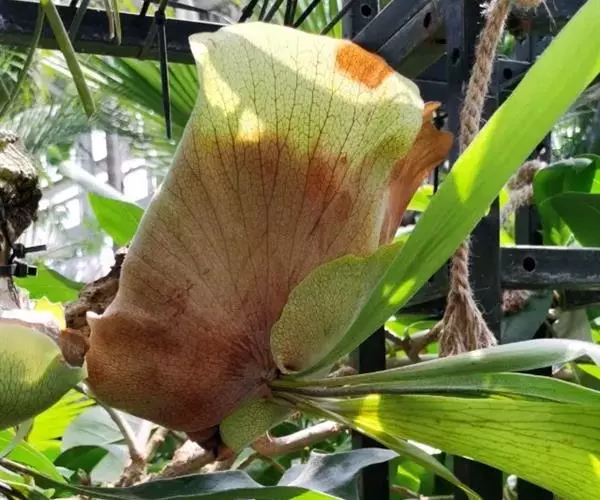 附生植物。根状茎肉质,短而横卧,密被鳞片;鳞片淡棕色或灰白色,中间深褐色,坚硬,线形,长10毫米,宽4毫米。叶2列,二型;基生不育叶(腐殖叶)宿存,厚革质,下部肉质,厚达1厘米,上部薄,直立,无柄,贴生于树干上,长达40厘米,长宽近相等,先端截形,不整齐,3-5次叉裂,裂片近等长,圆钝或尖头,全缘,主脉两面隆起,叶脉不明显,两面疏被星状毛,初时绿色,不久枯萎,褐色。