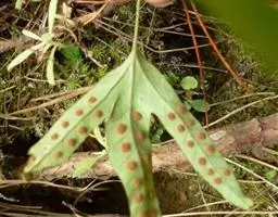 孢子囊散生于主裂片第一次分叉的凹缺处以下,不到基部,初时绿色,后变黄色;隔丝灰白色,星状毛。孢子绿色。