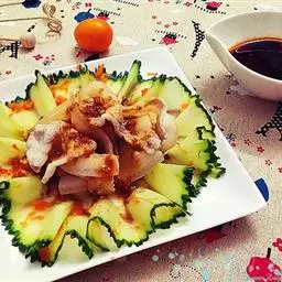 ①鲜花入杯中倒扣在盘中间,鱿鱼、海参、虾肉、鲜贝、熟鸡块、鱼片、冬笋用沸水焯一下捞出,码放在鲜花周围;