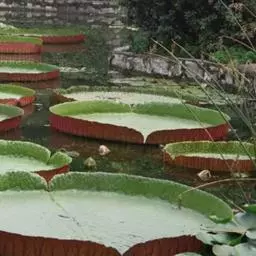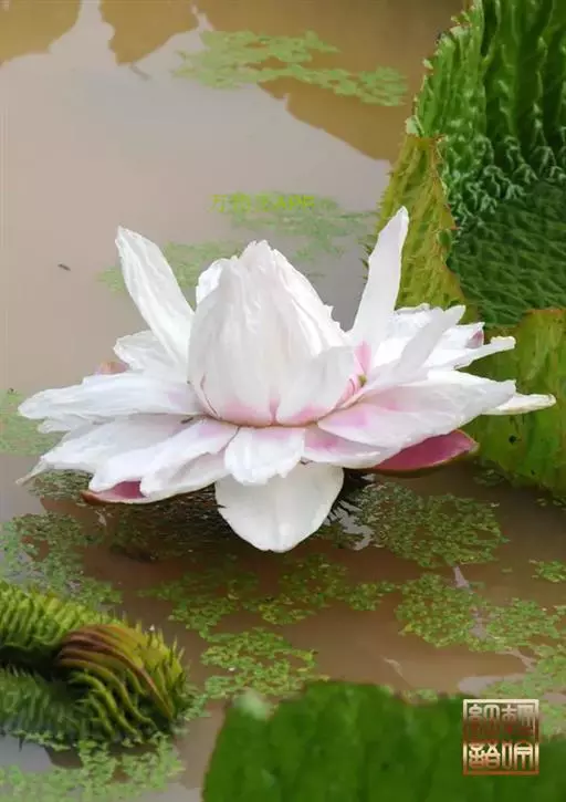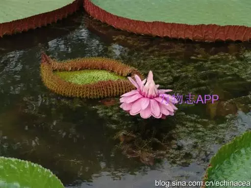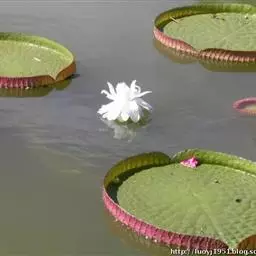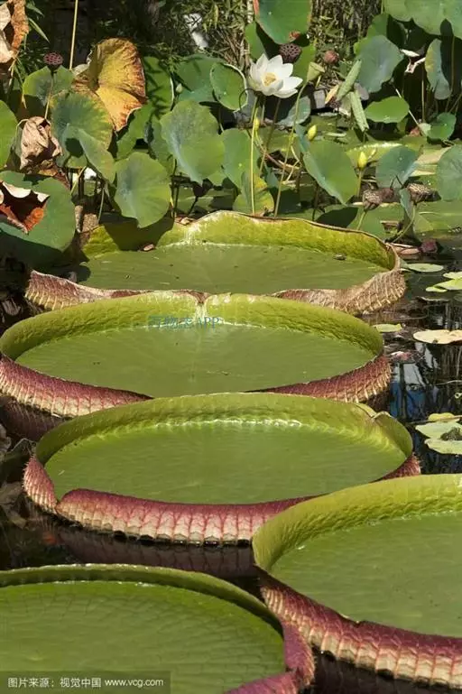 王莲是水景园中的瑰宝,口十片为圆形,叶片边缘向上卷曲,整个叶面浮于水面,十分奇特。王莲的单花花期仅三天,每天的颜色还不相同,开花时花蕾伸出水面,第一天开白色并伴有芳香,第二天变为粉红色,第三天则变为紫红色,然后闭合沉入水中,种子在水中成熟。 王莲主要有‘克鲁兹’王莲和‘亚马逊’王莲2个栽培种,‘克鲁兹’王莲的耐寒性、抗逆性较‘亚马逊’王莲强,栽培也较为容易,北方地区多引种 和栽培此种。‘克鲁兹’王莲叶片直径1.5m~1.8m,边缘直立可达10cm~15cm,叶背叶脉呈深红色,一般于8月中旬至9月开花。