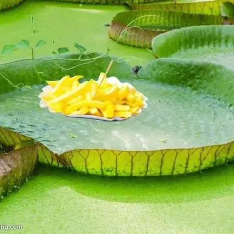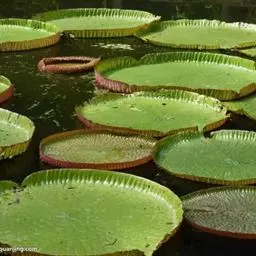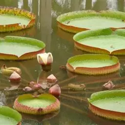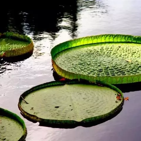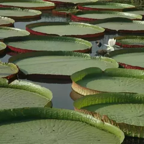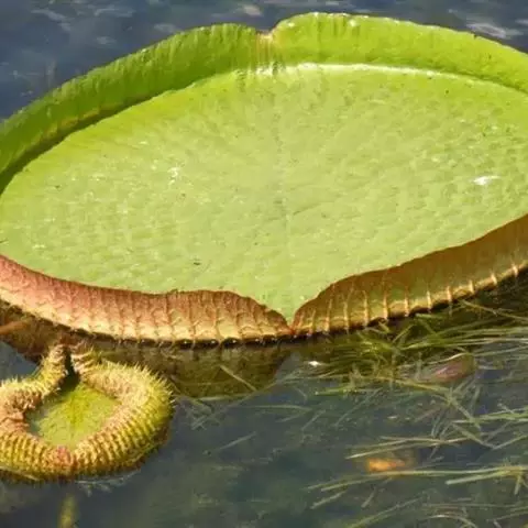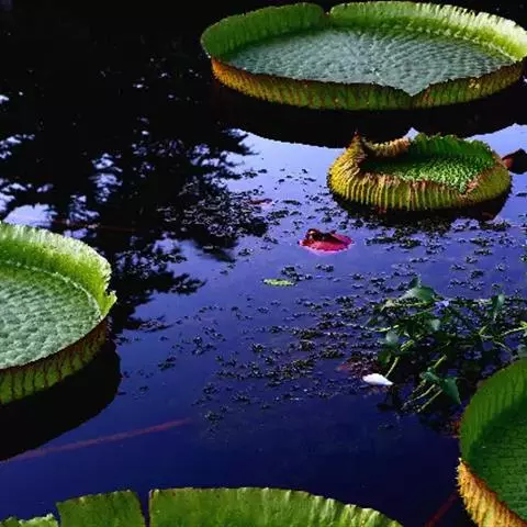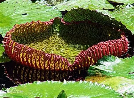 属睡莲科多年生或一年生大型浮叶草本。有直立的根状短茎和发达的不定须根,白色。果实成熟时,内含五六百粒种子,大小形状似豌豆,含有丰富淀粉,可食用,南美洲人因此称之为“水玉米”。王莲是水生有花植物中叶片最大的植物,其初生叶呈针状,长到2~3片叶呈矛状,至4~5片叶时呈戟形,长出6~10片叶时呈椭圆形至圆形,到11片叶后叶缘上翘呈盘状,叶缘直立,叶片圆形,像圆盘浮在水面,直径可达2米以上,叶面光滑,绿色略带微红,有皱褶,背面紫红色,叶柄绿色,长2~4m,叶子背面和叶柄有许多坚硬的剌,叶脉为放射网状。