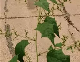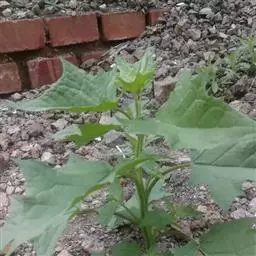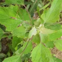 全草黄绿色。茎具条棱。叶片皱缩破碎,完整者展平,呈菱状卵形至宽披针形,叶上表面黄绿色,下表面灰黄绿色,被粉粒,边缘具不整齐锯齿;叶柄长约3cm。圆锥花序腋生或顶生。