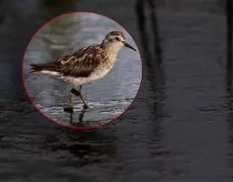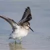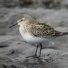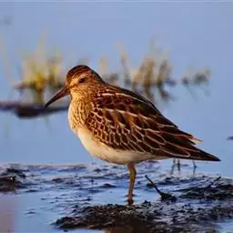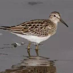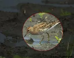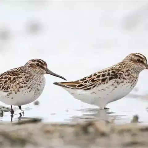 阔嘴鹬是涉禽,体长17厘米。特征为翼角常具明显的黑色块斑并具双眉纹。与黑腹滨鹬平滑下弯的嘴相比,…