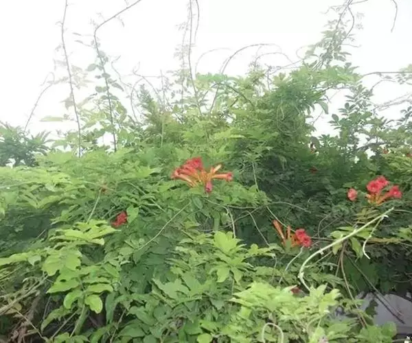 厚萼凌霄栽植前应对植株进行修剪,对主藤进行轻短截,主藤上着生的侧枝全部疏除,主藤萌发新枝后,在其上选择一个长势最壮、靠顶端较近的枝条做主藤的延长枝。待主藤延长枝长到一定高度后应及时搭设攀缘物进行牵引,使其尽早攀缘至棚架顶端,第二年早春对主藤延长枝进行轻短截,促发侧枝。主藤延长枝每侧保留3-4个侧枝,侧枝大致呈“丰”字形分布,第三年对侧枝进行轻短截,促生二级侧枝。按此方法修剪,再加上充足的水肥管理,藤蔓可很快铺满棚架。此后的修剪应着重对过密枝、重叠枝、病虫枝、干枯枝进行疏除,且勿使枝条重叠,否则会影响植株通风透光,引发病虫害。