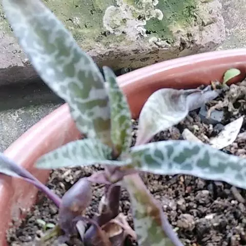 油点百合属于百合科的多年生草本植物,别称是豹纹红宝。原产于南非。株高约10-15公分,紫红色的茎肥大呈酒瓶状,茎顶着生3-5片肉质叶子,叶银绿色并具有不规则的斑点,叶背紫红色。花期春夏季,圆锥花序,小花绿色,约0.3公分,花瓣6枚,基部聚合呈钟型,雄蕊为紫红色。栽培需要有充足的光照。