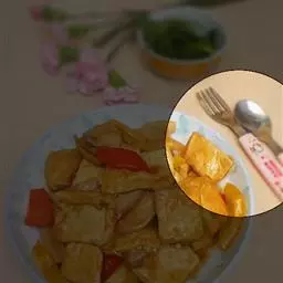 1.将豆腐切成小块,用沸水焯烫,捞出控干水分,晾凉。玉兰片、木耳