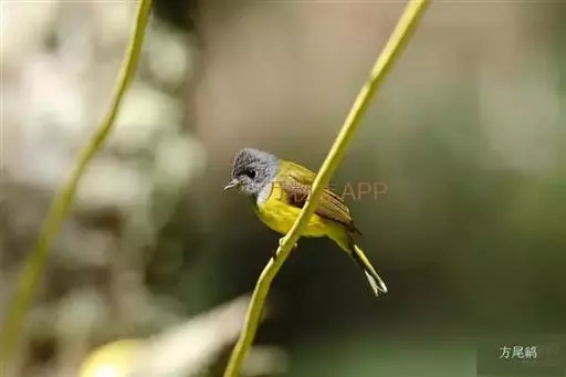 方尾鹟(学名:Culicicapa ceylonensis):体重6-11克,体长102-130毫米。是一种体型小而独具特色的鹟。头偏灰,略具羽冠,嘴扁平,嘴基宽阔几成等边三角形,嘴须发达长而多,几达嘴端口;头顶至后颈黑灰色,背橄榄绿色,两翅和尾黑灰色,翅上覆羽和飞羽羽缘橄榄黄绿色。喉、胸灰色,其余下体黄色。虹膜褐色,嘴上嘴黑色,下嘴角质色,脚黄褐色。