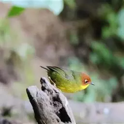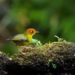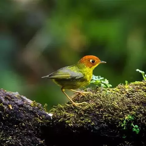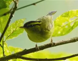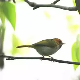 棕脸鹟莺:体长10厘米,是一种色彩亮丽而有特色的莺鸟。头栗色,具黑色侧冠纹。上体绿,腰黄色。下体白,…