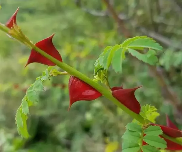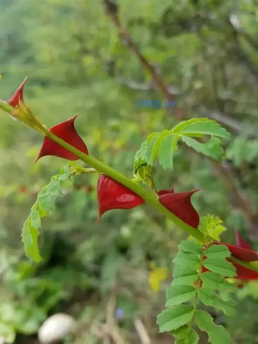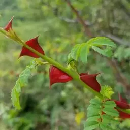 皮刺极宽扁,常近于相连而呈翅状,幼时深红,半透明.本种与同属植物峨眉蔷薇形态很近似,但是茎条上有很硬的扁刺,故名