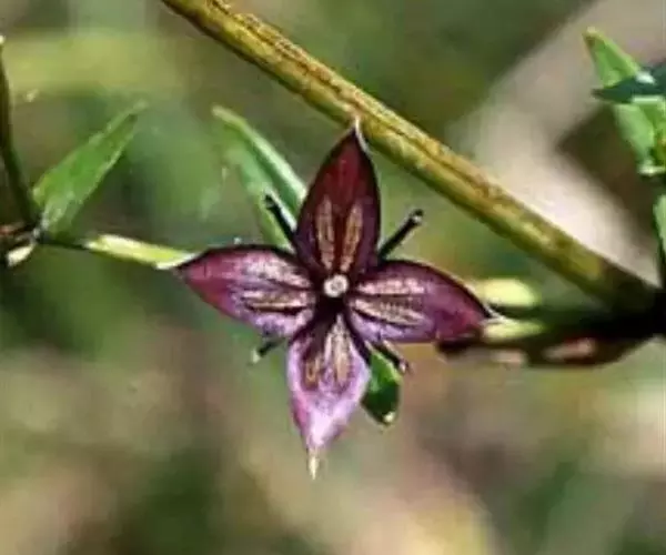 一年生草本,高15-60厘米。主根明显,淡黄色。茎直立,四棱形,棱上有窄翅,下部直径2-5毫米,从基部起作塔形或帚状分枝,枝斜展,有棱。叶无柄,卵状披针形至狭披针形,长8-35毫米,宽3-10毫米,先端钝,基部略呈心形,半抱茎,下面中脉明显突起。圆锥状复聚伞花序多花,占据了整个植株;花梗直立或斜伸,细瘦,四棱形,长至5厘米;花4数,直径8-13毫米;花萼绿色,长为花冠的1/2-2/3,裂片线状披针形或披针形,长4-7毫米,先端急尖,背面具明显的3脉;花冠暗紫红色,裂片披针形,长7-9毫米,先端渐尖,具尖头,基部具2个腺窝,腺窝沟状,狭矩圆形,深陷,边缘具柔毛状流苏;子房无柄,矩圆形,花柱粗短,柱头2裂,裂片半圆形。蒴果矩圆状披针形,长8-14毫米,先端尖;种子深褐色,椭圆形,长0.8-1毫米,表面具细网状突起。花果期7-10月。