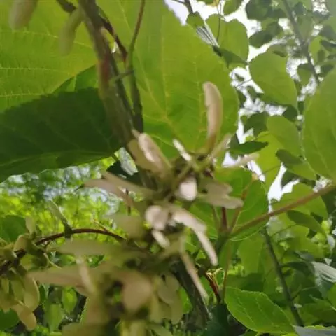 花杂性,雄花与两性花同株,常生成仅长6-7 厘米的短圆锥花序,总花梗长约3 厘米,顶生于着叶的小枝上,叶已长大后花始开放;萼片4,黄绿色,卵状长圆形,先端钝形,长约2.5,毫米;花瓣4,淡黄白色,倒卵形,长约2毫米;雄蕊8,花丝无毛;花盘微被长柔毛,微裂,位于雄蕊外侧;子房密被白色的疏柔手,花柱无毛,2 裂,柱头反卷;花梗细瘦,长5-8毫米。翅果嫩时淡红色,成熟时淡黄色;小坚果凸起,脉纹显著,直径约6毫米;翅宽8-10毫米,连同小坚果长2-2.5厘米,张开成钝角。花期4月,果期9月。