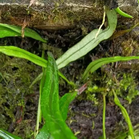 植株高约8~20厘米。根状茎横走,密被披针形鳞片;鳞片褐棕色,大部分不透明,仅叶边1~2行网眼透明,具锯齿。叶柄长1~3厘米,禾秆色;叶片线状披针形,或狭披针形,中部最宽0. 5~1. 3厘米,渐尖头,基部渐变狭并下延,干后黄绿色至淡黄绿色,或淡绿色至褐色,纸质。主脉上下均隆起,小脉不见。孢子囊群圆形或椭圆形,彼此相距较近,成熟后扩展几密接,幼时被圆形褐棕色的隔丝覆盖。
