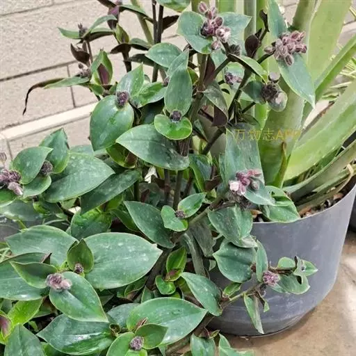 多年生常绿草本。茎匍匐,光滑,长可达60cm,带紫红色晕,有略膨大节,节处易生根。叶互生,长圆形或卵状长圆形,先端尖,下面深紫堇色,仅叶鞘上端有毛,具白色条纹。花小,多朵聚生成伞形花序,白色,为2叶状苞片所包被,花期夏、秋季。