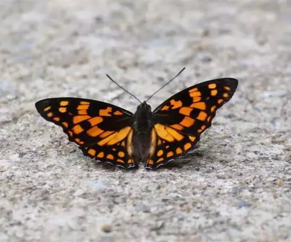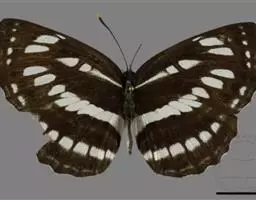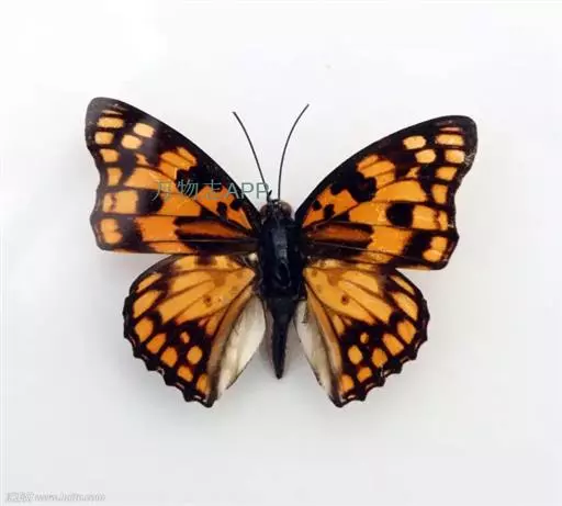 与帅蛱蝶近似,但雄蝶翅面黑色,所有条斑均橙黄色,无白色条斑,前翅中室内有二个橙黄色斑,前翅中域Cu1室斑眼状。雌蝶条斑的排列图案同雄蝶,但除前翅中室有二个黄色斑外,其余条斑均为白色。