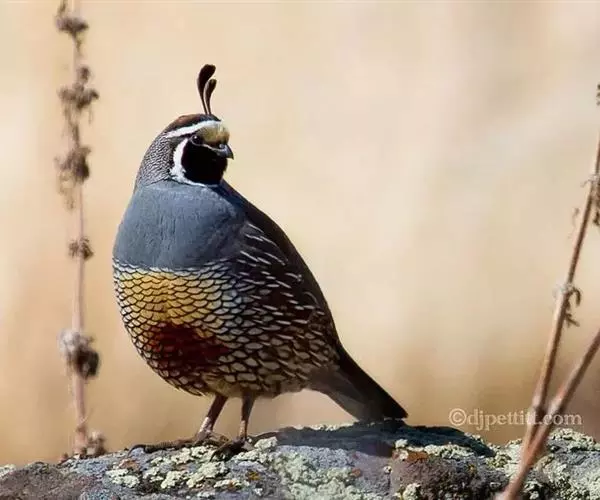 代表物种:普通鹌鹑雄性成鸟(夏羽):额部几全为栗黄色头顶、枕部和后颈黑褐色,羽端深栗黄色;中央具一条狭窄的白色冠纹。眉纹白色,从前额后达颈部;眼圈,眼先和颊部均赤褐色;耳羽栗褐色。上背为浅的黄栗色,具黄白色羽干纹;下背至尾上覆羽黑褐色,多具两端尖的浅黄色羽干纹;内外翈具黄褐色波状细横斑;肩羽亦然。两翅大部为带淡黄的橄榄色,杂以黄白色横斑;第一初级飞羽外翈狭,缘以淡黄色,其它初级飞羽的外翈均具浅赤褐色波状横斑;次级飞羽的内外翈亦具同色横斑,向内转浅。尾羽黑褐色,白嘴基越眼而达颈侧;额头侧及颏具白而略带浅黄色的羽干纹和羽缘,并具赤褐色横斑。颏、喉和颈的前部赤褐色,颊部和眼先的赤褐色连在一起;从颈部开始,伸出一个黑褐宽条,沿中线至喉部中央,扩大成黑褐色锚状纹,两侧向上延伸,几与耳羽连接。上胸灰白沾栗,羽干白色;颈侧和胸侧黑褐,杂以栗褐色,并具明显的白色羽干纹;两胁栗褐,杂以黑色,具更宽的白色羽干纹;下胸以至尾下覆羽灰白。