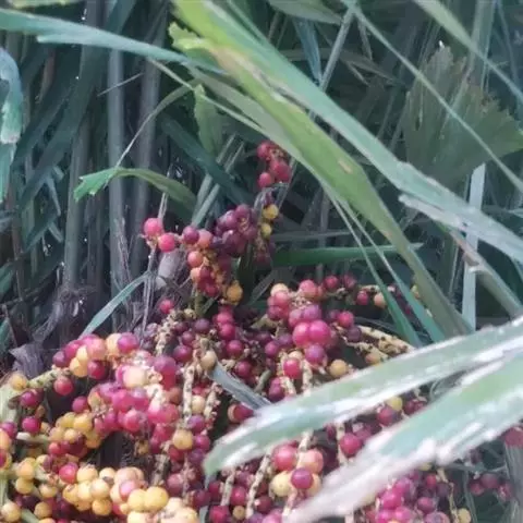 「集解」颂曰∶棕榈出岭南、西川,今江南亦有之。木高一、二丈,无枝条。叶大而圆, 有如车轮,萃于树杪。其下有皮重叠裹之,每皮一匝,为一节。二旬一采,皮转复生上。六、 七月生黄白花。八、九月结实,作房如鱼子,黑色。九月、十月采其皮用。《山海经》云∶ 石翠之山,其木多棕是也。藏器曰∶其皮作绳,入土千岁不烂。昔有人开冢得一索,已生根。 岭南有桄榔、槟榔、椰子、冬叶、虎散、多罗等木,叶皆与 榈相类。时珍曰∶棕榈,川、 广甚多,今江南亦种之,最难长。初生叶如白芨叶;高二、三尺则木端数叶大如扇,上耸, 四散歧裂,其茎三棱,四时不凋。其干正直无枝,近叶处有皮裹之,每长一层即为一节。干 身赤黑,皆筋络,宜为钟杵,亦可旋为器物。其皮有丝毛,错纵如织,剥取缕解,可织衣、 帽、褥、椅之属,大为时利。每岁必两、三剥之,否则树死,或不长也。三月于木端茎中出 数黄苞,苞中有细子成列,乃花之孕也,状如鱼腹孕子,谓之棕鱼,亦曰棕笋。渐长出苞, 则成花穗,黄白色。结实累累,大如豆,生黄熟黑,甚坚实。或云∶南方此木有两种∶一种 有皮丝,可作绳;一种小而无丝,惟叶可作帚。郑樵《通志》以为王彗者,非也。王彗乃落 帚之名,即地肤子。别有蒲葵,叶与此相似而柔薄,可为扇、笠,许慎《说文》以为棕榈亦 误矣。