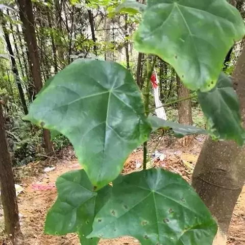 常绿乔木,高达30米,嫩枝有褐色柔毛,老枝变秃净,节膨大,有环状托叶痕。叶革质,阔卵形,长8-13厘米,宽5-9厘米,先端渐尖,基部阔楔形,全缘或幼叶为掌状3浅裂,上面深绿色,发亮,下面无毛,常有细小瘤状突起,掌状脉3-5条,在上面很显著,在下面隆起;叶柄长3-5厘米,初时有柔毛,以后变秃净;托叶狭矩圆形,稍弯曲,长2-4厘米,宽8-13毫米,被柔毛,早落。