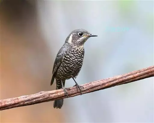 雌鸟上体包括两翅和尾在内翈为橄榄褐或灰橄榄褐色,尤以头顶至后颈较灰,背具黑色次端横斑和灰白色羽缘,在背形成隐约可见的黑色鳞状斑,到腰和尾上覆羽黑色横斑变得较为清晰可见。翅褐色具淡色羽缘,内侧覆羽亦大多具横斑。尾褐色、外翈稍沾灰蓝色。眼先和眼周棕白色或乳黄白色,耳羽黑色具淡白色羽轴纵纹,其后有一棕白色或皮黄斑,颈侧皮黄色。下体皮黄色或棕白色,颏、喉纯乳白色,其余下体密杂以黑褐色横斑或鳞状斑。