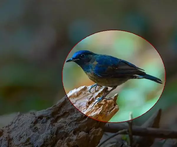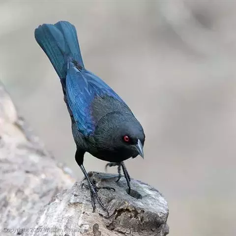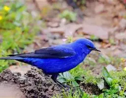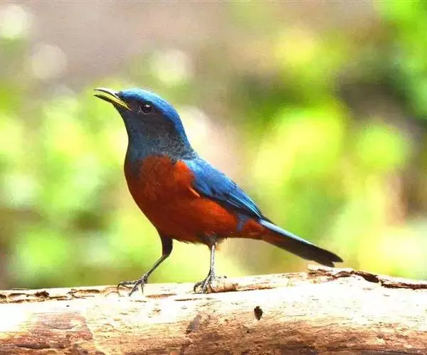 雄鸟从头到尾等整个上体亮钴蓝色,尤以头顶和腰最亮。上背和两肩沾黑。眼先、颊、耳羽、头侧和颈侧黑色。翅上小覆羽和中覆羽与背相同亦为钻蓝色沾黑,其余翅覆羽和飞羽黑色,除最外侧两枚初级飞羽外,其余飞羽和覆羽外翈均沾钴蓝色。中央尾羽钴蓝色,外侧尾羽内翈暗褐色,外翈亦为钴蓝色,因而尾外表面亦为钴蓝色,尤以羽缘较辉亮,尾下表面则为黑褐色。下体颏、喉黑色而缀有蓝色,其余下体栗红色,腋羽和翅下覆羽为栗红色。