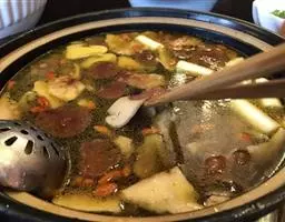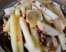 兔肉剁小块,加清水浸泡10分钟,撒上胡椒粉、姜、葱、白酒搅拌均匀。