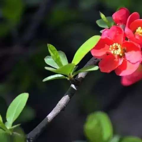落叶灌木,高达2米,枝条直立开展,有刺;小枝圆柱形,微屈曲,无毛, 皱皮木瓜 紫褐色或黑褐色,有疏生浅褐色皮孔;冬芽三角卵形,先端急尖,近于无毛或在鳞片边缘具短柔毛,紫褐色。叶片卵形至椭圆形,稀长椭圆形,长3-9厘米,宽1.5-5厘米,先端急尖稀圆钝,基部楔形至宽楔形,边缘具有尖锐锯齿,齿尖开展,无毛或在萌蘖上沿下面叶脉有短柔毛;叶柄长约1厘米;托叶大形,草质,肾形或半圆形,稀卵形,长5-10毫米,宽12-20毫米,边缘有尖锐重锯齿,无毛。花先叶开放,3-5朵簇生于二年生老枝上;花梗短粗,长约3毫米或近于无柄;花直径3-5厘米;萼筒钟状,外面无毛;萼片直立,半圆形稀卵形,长3-4毫米。宽4-5毫米,长约萼筒之半,先端圆钝,全缘或有波状齿,及黄褐色睫毛;花瓣倒卵形或近圆形,基部延伸成短爪,长10-15毫米,宽8-13毫米,猩红色,稀淡红色或白色;雄蕊45-50,长约花瓣之半;花柱5,基部合生,无毛或稍有毛,柱头头状,有不显明分裂,约与雄蕊等长。果实球形或卵球形,直径4-6厘米,黄色或带黄绿色,有稀疏不显明斑点,味芳香;萼片脱落,果梗短或近于无梗。花期3-5月,果期9-10月。