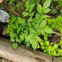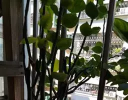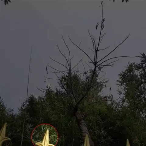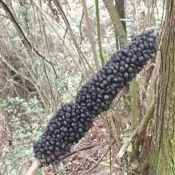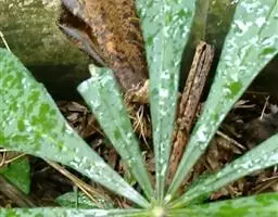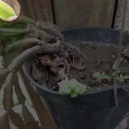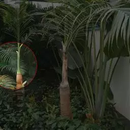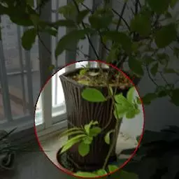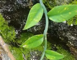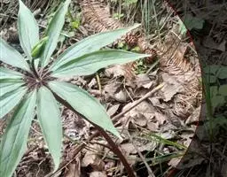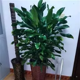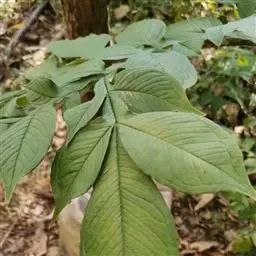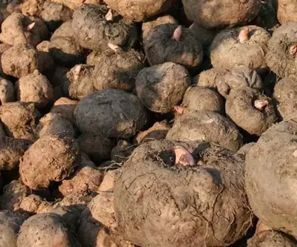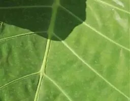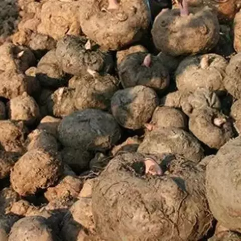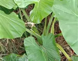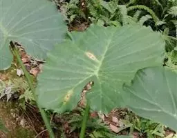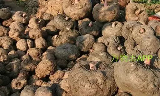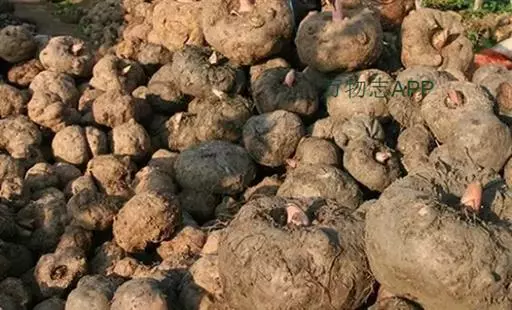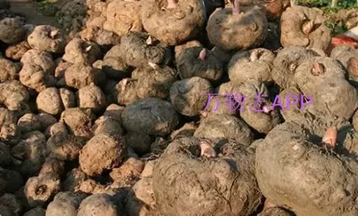 魔芋地下块茎为扁球形,个大,叶柄粗壮,圆柱形,淡绿色,有暗紫色斑,掌状复叶,里面是白色的。