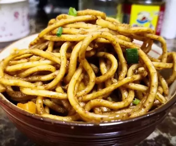 将热腾腾出锅的面条盛入碗中,浇淋上浓淡相宜的芝麻酱;