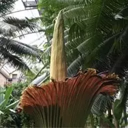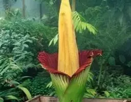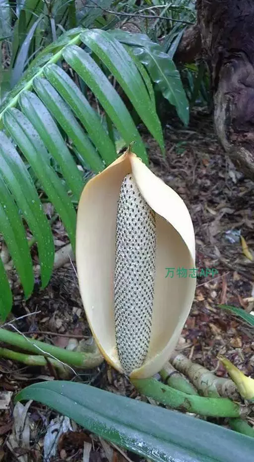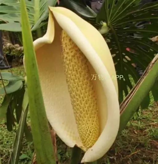 花序柄长15-30厘米,粗1-3厘米,绿色,粗糙。佛焰苞厚革质,宽卵形,舟状,近直立,先端具喙,长20-25厘米,人为展平宽15-17.5厘米,苍白带黄色。肉穗花序近圆柱形,长17.5-20厘米,粗4-5厘米,淡黄色。雄蕊花丝线形,花粉黄白色。雌蕊陀螺状,长7-8毫米,柱头小,线形,纵向,黄色,稍凸起。浆果淡黄色,柱头周围有青紫色斑点,长1厘米,粗7.5毫米。花期8-9月,果于异年花期之后成熟。