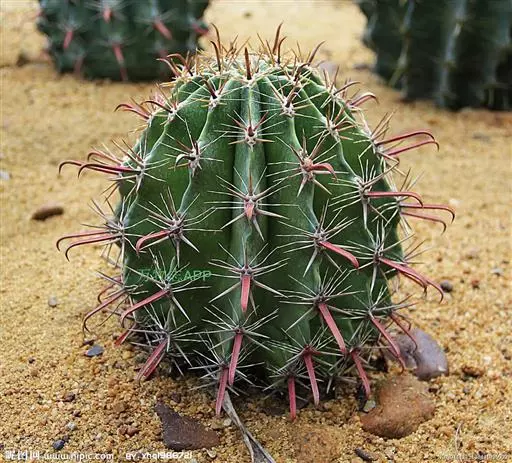 植物形态:多年生常绿肉质草本,高约15cm。茎球形,椭圆形或倒卵形,绿色,肉质,有纵棱12~14条,棱上有丛生的针刺,通常每丛6~10枚,少数达15枚,长2-4cm,硬直,黄色或黄褐色,长短不一,辐射状,刺丛内着生密集的白绒毛。中细小,生于刺丛内,早落。
