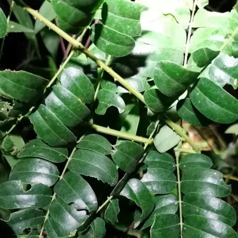 高8-12米;树皮粗糙;嫩枝密被短柔毛,老枝无毛。二回羽状复叶;总叶柄近基部及叶轴上羽片着生处均有腺体;叶轴被短柔毛或无毛;羽片2-4对,长6-15厘米;小叶4-8对,长椭圆形或略斜的长椭圆形,长2-4.5厘米,宽(0.9-)1.3-2厘米,先端圆钝或微凹,两面无毛或下面疏被微柔毛,中脉略偏于上缘。