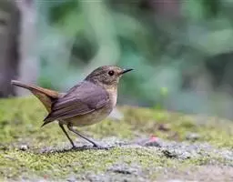 红尾歌鸲:体长13-15厘米。上体橄榄褐色。尾羽棕栗色,眼先和颊黄褐色,眼周淡黄褐色。…