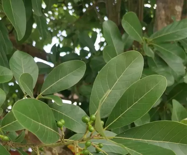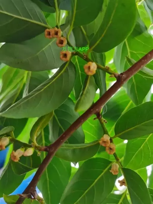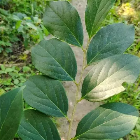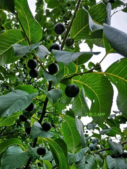 该种冬芽先端尖;叶椭圆形至长椭圆形,侧脉每边7-10条;果几无柄,近球形,直径1-2厘米,初熟时黄色,渐变蓝黑色,常被白色薄蜡层,宿存萼裂片4,先端钝圆。