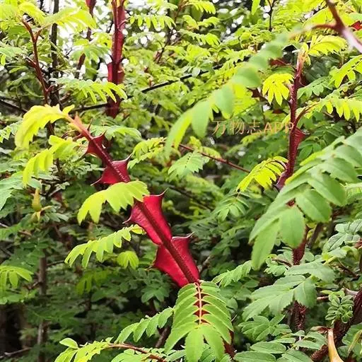 幼枝密被针刺及宽扁大形紫色皮刺,小叶片上面叶脉明显,…