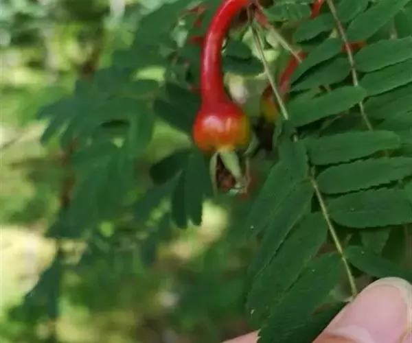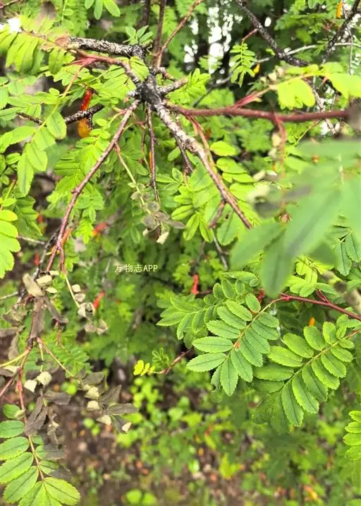 小叶5-9,长圆形或倒卵长圆形,锯齿在前半部,基部全缘,两面无毛;果实梨形,果梗较短,稍膨大,红色。