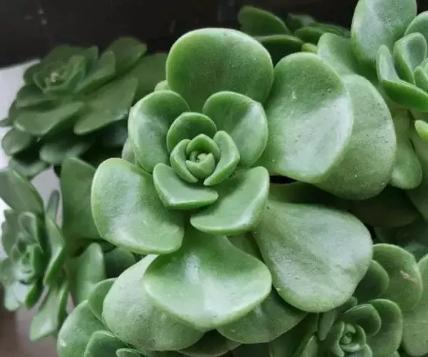 在阳光充足、温差大的环境下叶色会变得偏白。厚叶月影生长速度一般,为多年生植物,有小小的半木质茎,不容易长高,小苗不爱长侧芽,一旦成株开花后,才会大量萌发侧芽,群生的厚叶月影非常漂亮,厚叶月影花开穗状倒钟型花,五个花瓣,异株授粉。