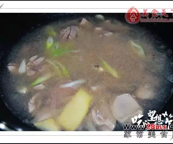 步骤三:锅中注水烧沸,放入猪腰块、猪瘦肉块、腰果碎、核桃仁、姜片,大火煮沸,转小火煮约3小时,加盐调味即成。