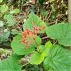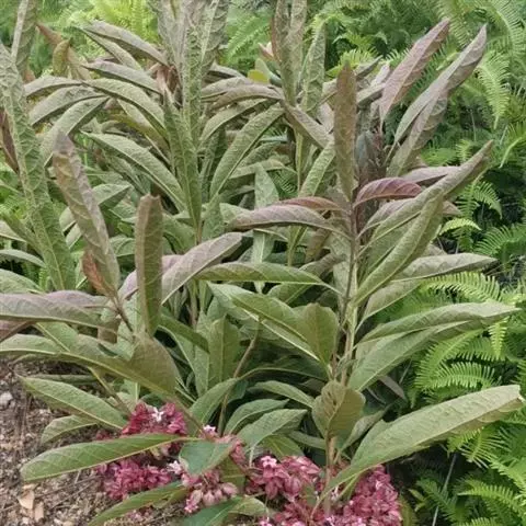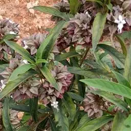 圆锥花序顶生.杯形花萼5裂,裂片圆形,绿带紫色。