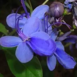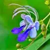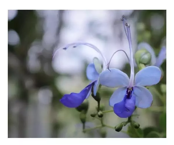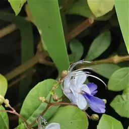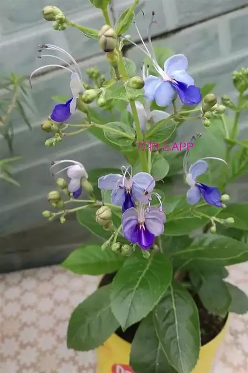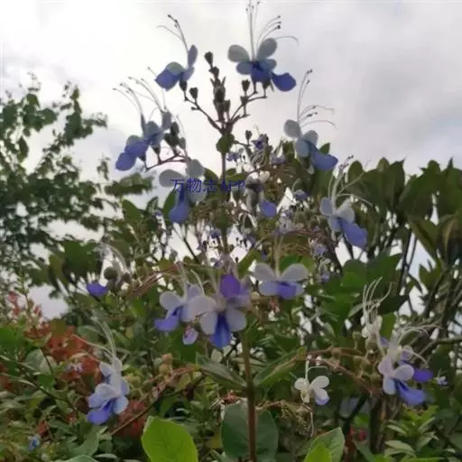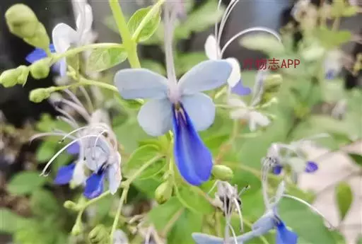 花:花朵造形似蝴蝶,花色为浅蓝到紫色,花瓣平展花冠两侧对称,花冠白色,唇瓣紫蓝色,雄蕊细长。