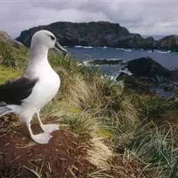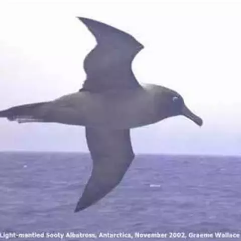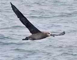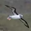 黑背信天翁是一种中型的信天翁,81厘米长,翼展195-215厘米,体重2210-2800克,寿命12年。是一种有极长翼羽的大鸟。雄性略大。特征为自颏至臀部为全白色,但翼上及背深色。翼下主要为白色,具深色边缘,覆羽具近黑色纵纹。眼及眼周深色。飞行时脚略伸出尾后。幼鸟似成鸟但嘴灰色较重。