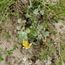 一年生草本。根部有丰富的根瘤;茎直立或匍匐,长30-80厘米,茎和分枝均有棱,被黄色长柔毛,后变无毛。叶通常具小叶2对;托叶长2-4厘米,具纵脉纹,被毛;叶柄基部抱茎,长5-10厘米,被毛;小叶纸质,卵状长圆形至倒卵形,长2-4厘米,宽0.5-2厘米,先端钝圆形,有时微凹,具小刺尖头,基部近圆形,全缘,两面被毛,边缘具睫毛;侧脉每边约10条;叶脉边缘互相联结成网状;小叶柄长2-5毫米,被黄棕色长毛;花长约8毫米;苞片2,披针形;小苞片披针形,长约5毫米,具纵脉纹,被柔毛;萼管细,长4-6厘米;花冠黄色或金黄色,旗瓣直径1.7厘米,开展,先端凹入;翼瓣与龙骨瓣分离,翼瓣长圆形或斜卵形,细长;龙骨瓣长卵圆形,内弯,先端渐狭成喙状,较翼瓣短;花柱延伸于萼管咽部之外,柱头顶生,小,疏被柔毛。荚果长2-5厘米,宽1-1.3厘米,膨胀,荚厚,种子横径0.5-1厘米。花果期6-8月。