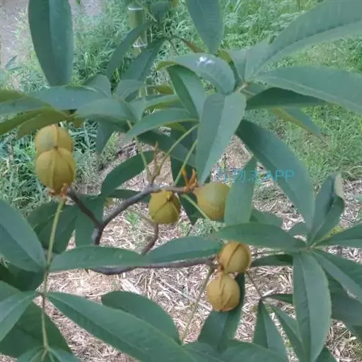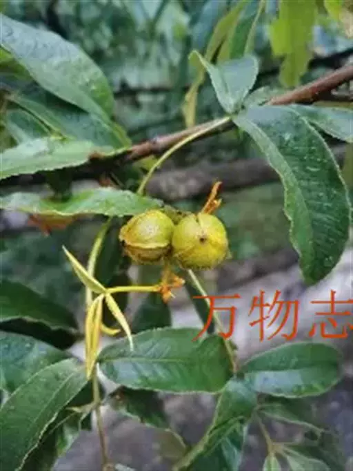 乔木,高达10-20米,胸径30-60厘米 山核桃生长期果实 ;树皮平滑,灰白色,光滑;小枝细瘦,新枝密被盾状着生的橙黄色腺体,后来腺体逐渐稀疏,1年生枝紫灰色,上端常被有稀疏的短柔毛,皮孔圆形,稀疏。 复叶长16-30厘米,叶柄幼时被毛及腺体,后来毛逐渐脱落,叶轴被 毛较密且不易脱落,有小叶5-7枚;小叶边缘有细锯齿,幼时上面仅中脉、侧脉及叶缘有 柔毛,下面脉上具宿存或脱落的毛并满布橙黄色腺体,后来腺体逐渐稀疏;侧生小叶具短的小叶柄或几乎无柄,对生,披针形或倒卵状披针形,有时稍成镰状弯曲,基部楔形或略成 圆形,顶端渐尖,长10-18厘米,宽2-5厘米,顶生小叶具长约5-10毫米的小叶柄,同上端的侧生小叶同形、同大或稍大。 雄性葇荑花序3条成1束,花序轴被有柔毛及腺体, 长10-15厘米,生于长约1-2厘米的总柄上,总柄自当年生枝的叶腋内或苞腋内生出。 雄花具短柄;苞片狭,长椭圆状线形,小苞片三角状卵形,均被有毛和腺体;雄蕊2-7枚, 着生于狭长的花托上,花药具毛。雌性穗状花序直立,花序轴密
