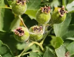 果实近球形,多汁液,直径1-1.4厘米,红色或橙黄色,密被短绒毛;核具明显洼孔。花期5-6月,果期8-9月。