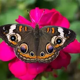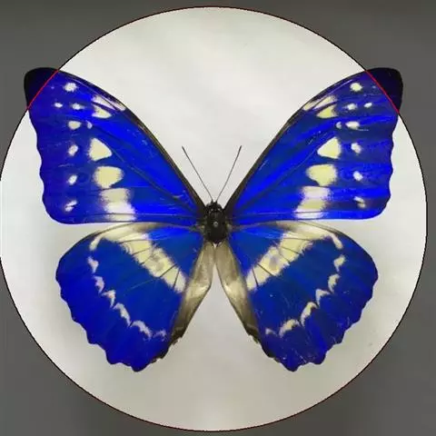 孔雀蛱蝶展翅宽50~60mm。翅膀表面红色,上、下翅有一大型彩色眼纹;翅膀腹面淡褐色,拟似烟熏枯叶…