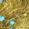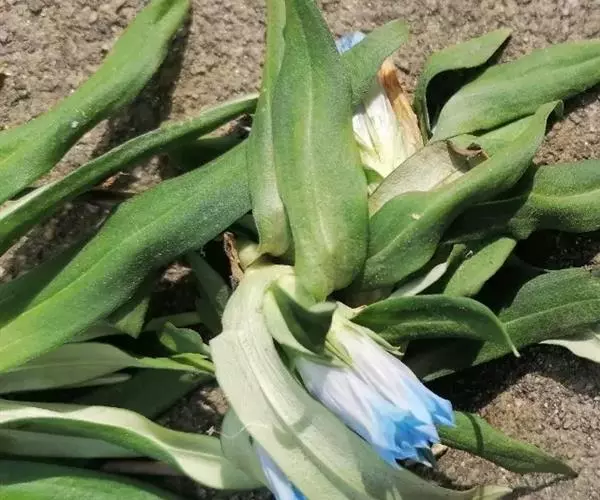 花多数,簇生枝端呈头状,被包围于最上部的苞叶状的叶丛中;无花梗;花萼狭倒锥形,长1.4-1.6厘米,萼筒膜质,全缘不开裂,裂片绿色,不整齐,2个大,3个小,线状披针形或披针形,长3-7毫米,先端渐尖,边缘有乳突,裂片间弯缺宽,截形;花冠蓝色,无斑点和条纹,狭漏斗形,长2.5-4厘米,裂片卵状三角形,长2.5-4毫米,先端具尾尖,全缘,褶偏斜,截形或三角形,长1-1.5毫米,全缘或边缘有不明显波状齿;雄蕊着生于冠筒下部,整齐,花丝线状钻形,长10-15毫米,花药狭矩圆形,长1.5-2毫米;子房线状椭圆形,长10-12毫米,两端渐狭,柄长5-7毫米,花柱线形,连柱头长4-6毫米,柱头2裂,裂片线形。