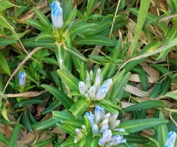 龙胆植物花色艳丽,色彩丰富,有紫、白、蓝、黄白等多种颜色,适宜作为花坛、花镜或盆花。龙胆最高不过四、五十厘米,大部份是矮小贴地丛生。一株上有许多分枝,花生于枝上顶端,成古钟形或漏斗形,有4-5个裂瓣,全缘的,也有细裂的成流海似的须。龙胆花在秋冬季一片枯黄的草丛中临风开放,显得分外朴实和幽静,龙胆开花一片片一簇簇,临风摇曳,显出一种淡雅、素静的美,因而成为著名的花卉。