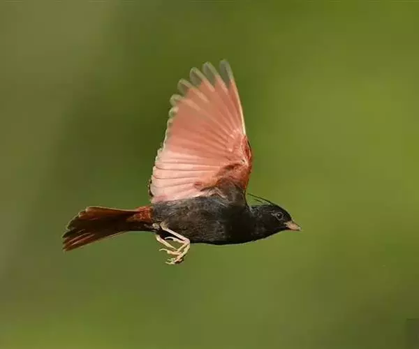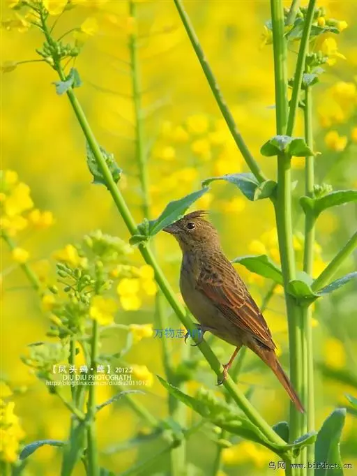凤头鹀(学名:Emberiza lathami):属小型鸣禽,体重21-31克,体长134-175毫米。以头顶的细长羽冠为特征,雄鸟全身几乎均为黑色具蓝色光泽,两翅和尾以及尾上覆羽栗红色。雌鸟具短的褐色羽冠,上体暗橄榄褐色,两翅暗褐色具栗色或栗红色羽缘。尾暗褐色,最外侧一对尾羽几乎全为栗色或栗红色,次一对的外侧尾羽具大的楔状白斑。下体污皮黄色或暗褐皮黄色,胸具窄的黑色纵纹。